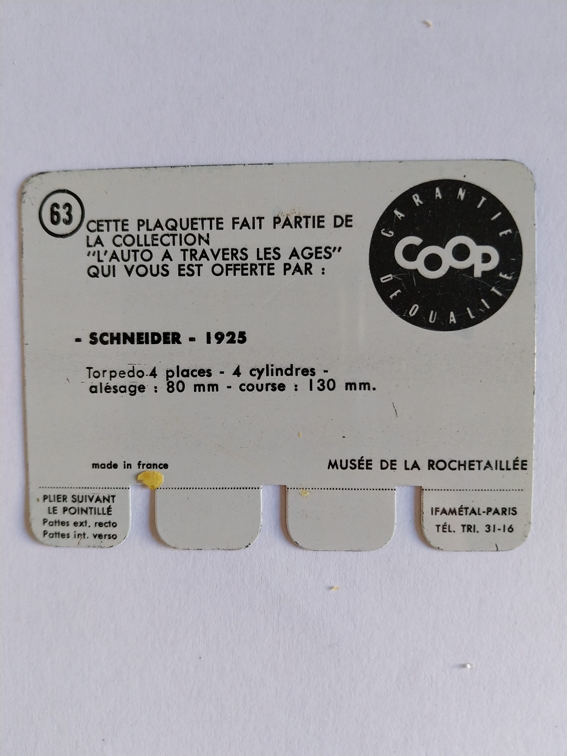 Nous vous proposons cette carte automobile COOP originale de 1964, N°63, représentant la SCHNEIDER 1925.